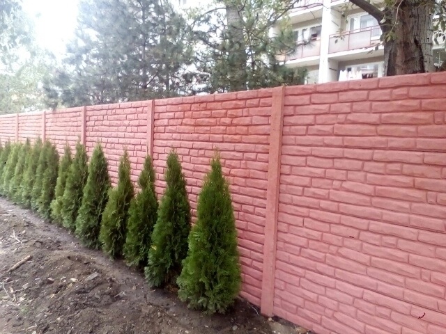 Co se týče dalších volitelných povrchových úprav betonového plotu, nabízí se zde možnost nátěru fasádní barvou v jakémkoli odstínu dle představ zákazníka. Tato estetická úprava je u zákazníků poměrně oblíbená a ti zručnější zvládnou provést nástřik i svépomocí. Pro provedení nástřiku je třeba oplocení první napenetrovat a poté nanést vybranou barvu. Není nutné kupovat specializované barvy, postačí běžné fasádní barvy. Zákazník si touto cestou může uzpůsobit barvu plotu do požadovaného odstínu například dle svého domu. Nástřik fasádní barvou přináší i další estetickou výhodu – vrstva nanesené barvy do velké míry skryje póry na dílcích, jejichž výskyt je u provedení standard běžný. Povrch desek se tak krásně zacelí a sjednotí do hladka. Můžete si tak oplocení nejen přebarvit dle libosti, ale také šikovně skryjete drobné nedokonalosti dílců.